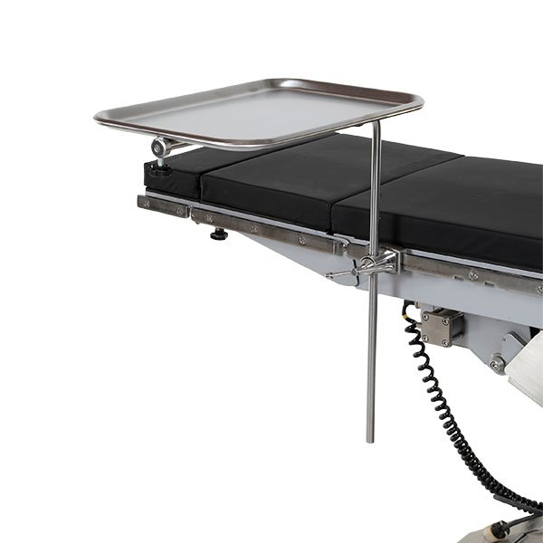 To clamp it to the OR Table side rail, it will fit in most standard rail clamps for a round accessory such as a clark socket. This allows the tray to swivel 360 degrees. The upright can also be adjusted to any angle and the tray leveled to hold instruments.